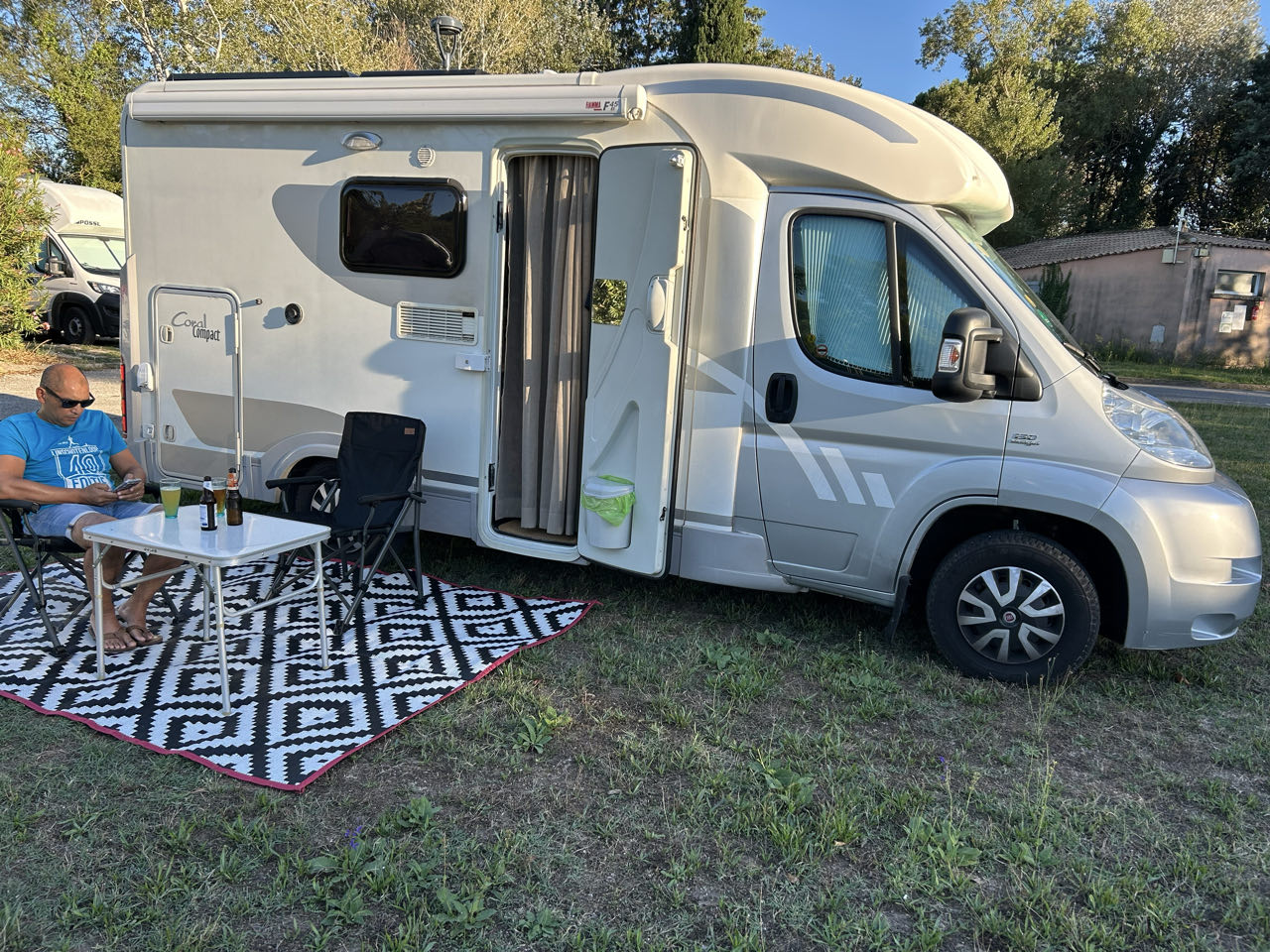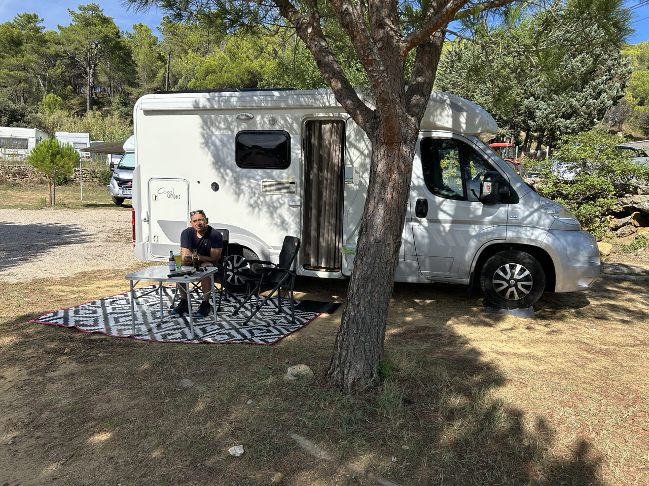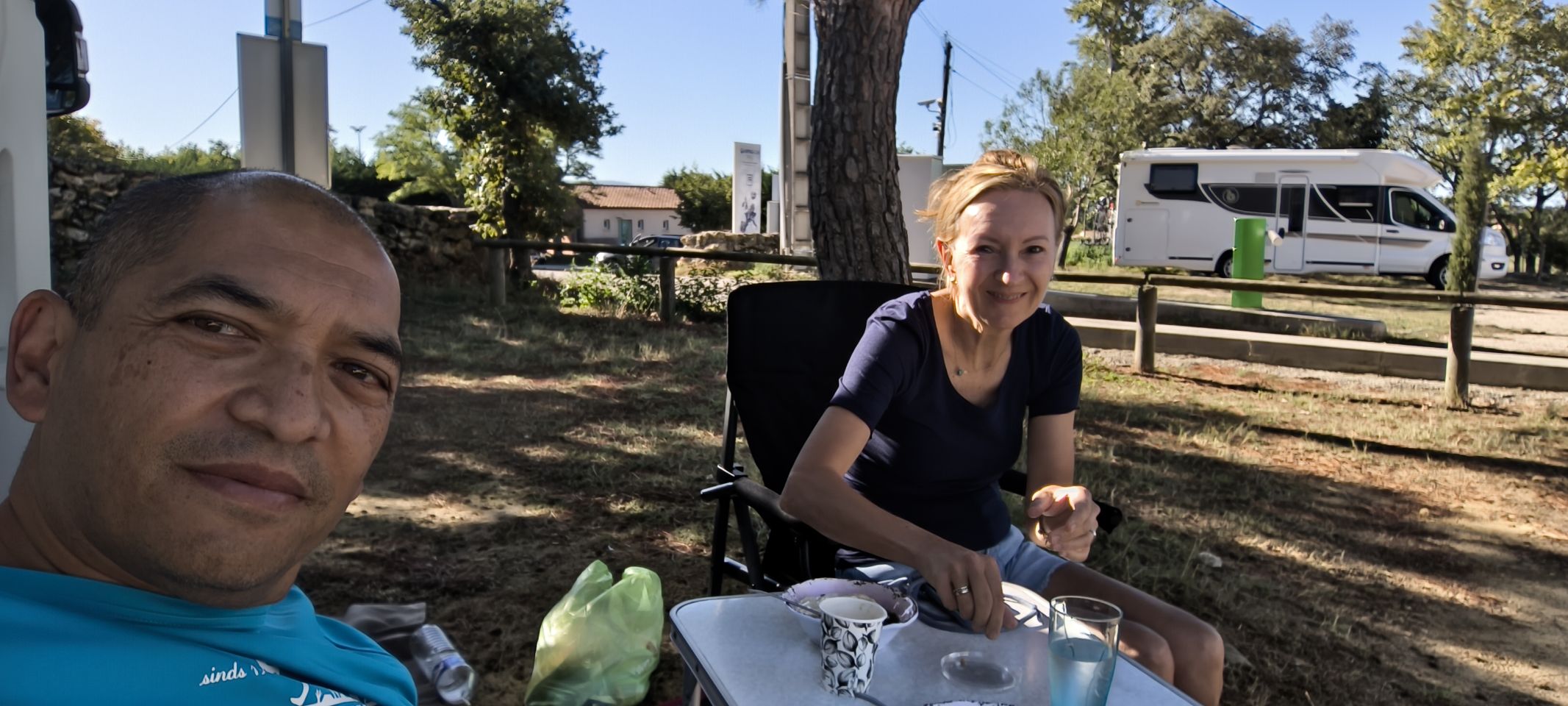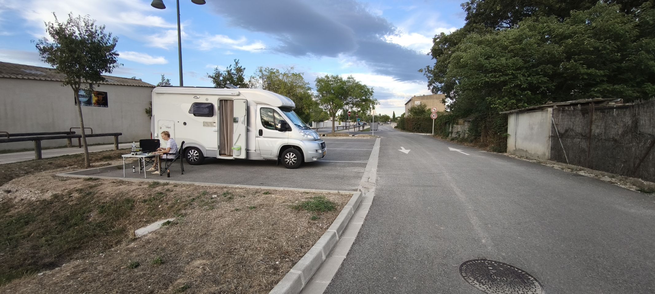 Op nieuwe camperplek een stokbroodje en een Beaumes-de-Venise: 🥖🍷!